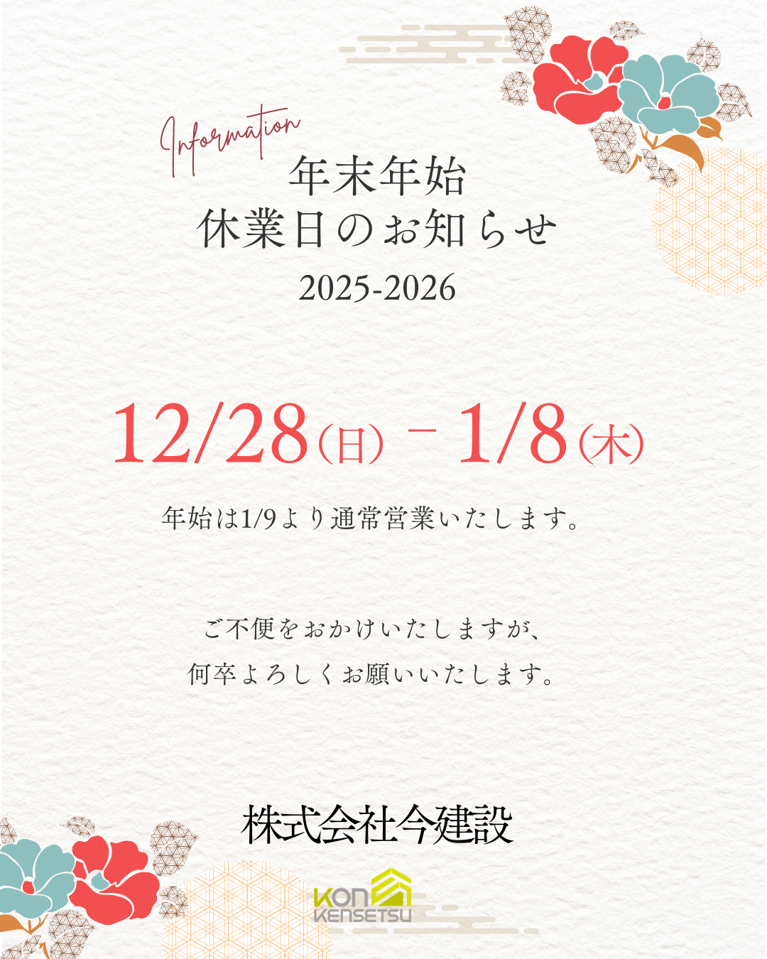 年末年始休業のお知らせ 2025年12月26日 平素は格別のお引き立てを賜り、厚く御礼申し上げます。 さて、誠に勝手ながら 弊社では下記の通り休業とさせていただきます。 休業期間中は、ご不便、ご迷惑をおかけしますが 何卒ご了承くださいますようお願い申し上げます。 ************************* 年末年始休業 12月28日(日)~1月8日(木) 1月9日(金)~ 通常営業 *************************